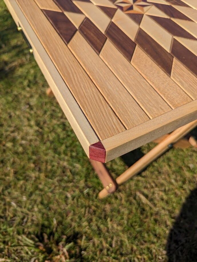 ”銘木”と呼ばれる天然木や無垢材を使用し、1ピースずつ切り出し寄せ合わせた天板に、折り畳みフットを組み合わせました。