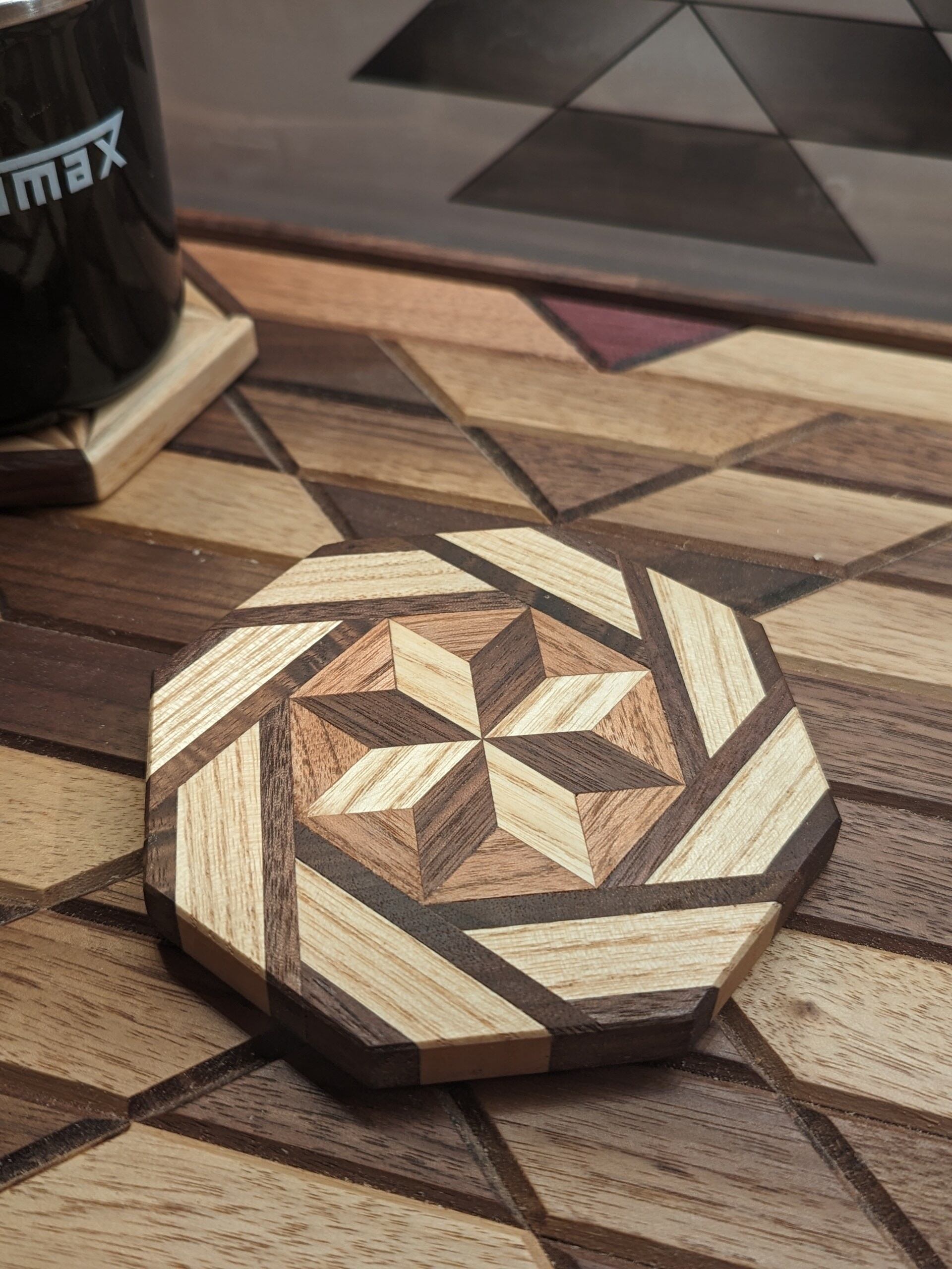 寄木コースターは、1枚1枚丁寧に手作業で作り上げています。そのため、それぞれのコースターには、技術と温かみが込められています。木の種類や形状によっても異なる風合いが楽しめ、一つ一つのコースターが個性的です。